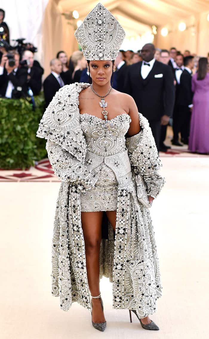 As the Met Gala for the year ringed in, celebs started walking the red carpet as per this year’s theme which was “Heavenly Bodies: Fashion and the Catholic Imagination”. There were some of the celebs who strictly abided by the theme while many ditched it in elegant way. Rihanna did an intricately embellished mini dress with a shawl-collar coat to which she paired her Christian Louboutin heels.