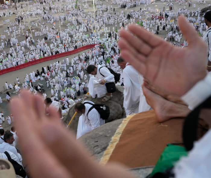 Muslim pilgrims gather at top of the rocky hill known as the Mountain of Mercy, on the Plain of Arafat, during the annual Hajj pilgrimage, near the holy city of Mecca, Saudi Arabia, Saturday, June 15, 2024. Masses of Muslims gathered at the sacred hill of Mount Arafat in Saudi Arabia for worship and reflection on the second day of the Hajj pilgrimage. The ritual at Mount Arafat, known as the hill of mercy, is considered the peak of the Hajj. It's often the most memorable event for pilgrims, who stand shoulder to shoulder, asking God for mercy, blessings, prosperity and good health. Hajj is one of the largest religious gatherings on earth.