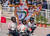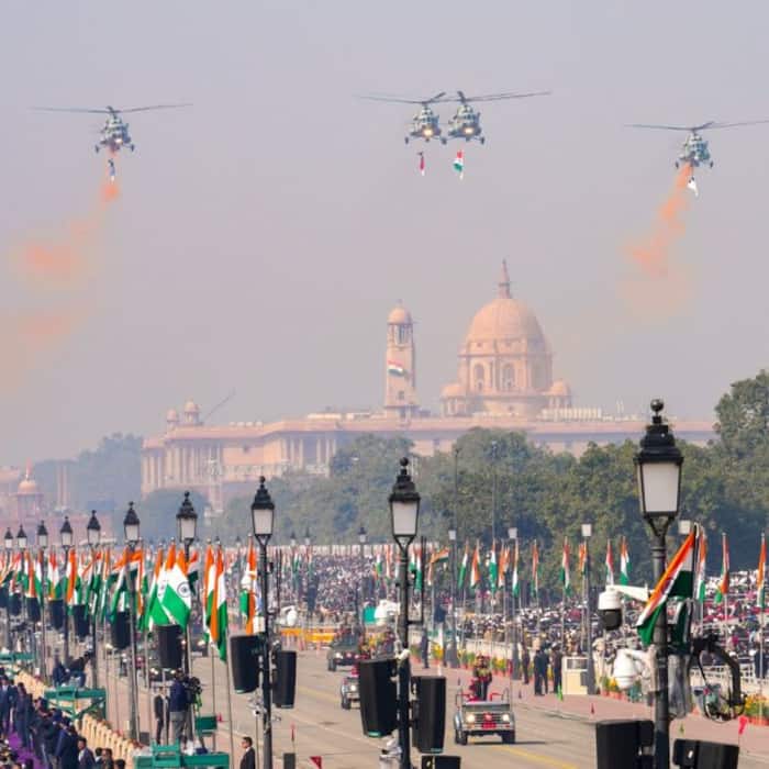 4 Mi-17 1V helicopters of the Indian Air Force’s (IAF) 129 helicopter unit perform a flypast in ‘Dhwaj’ formation while showering petals over the Kartavya Path during the 77th Republic Day Parade, in New Delhi, Monday, i.e., Jan 26, 2026.