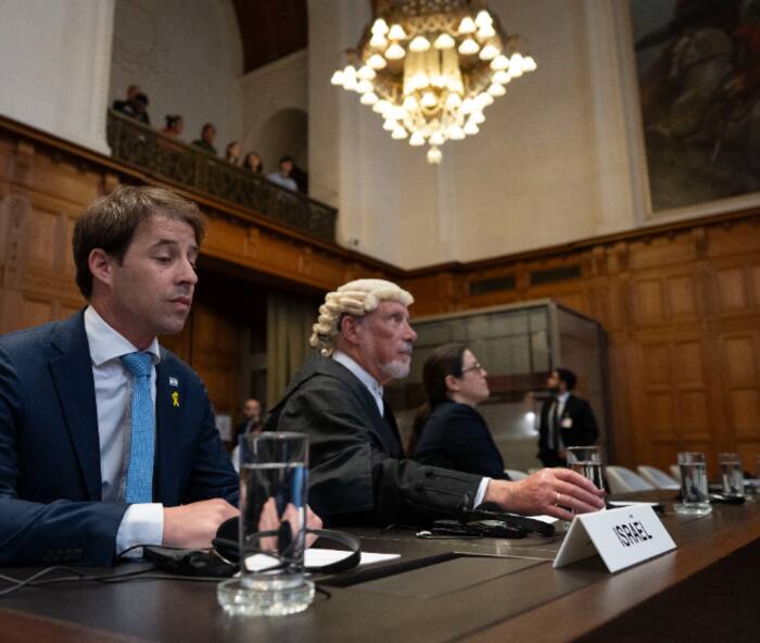 Israel legal team, with Yaron Wax, Malcolm Shaw and Avigail Frisch Ben Avraham, from left, wait for judges to enter the International Court of Justice, or World Court, in The Hague, Netherlands, Friday, May 24, 2024, where the top United Nations court was to rule on an urgent plea by South Africa for judges to order Israel to halt its military operations in Gaza and withdraw from the enclave.