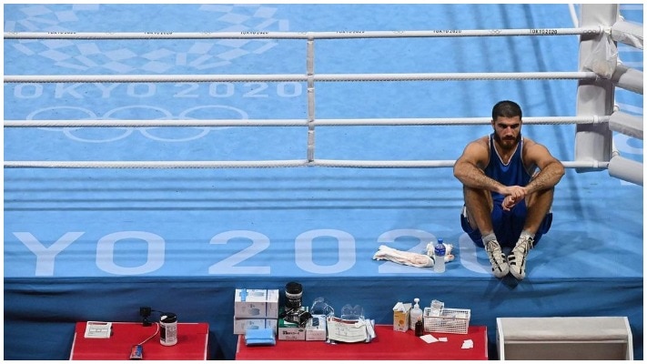 • In Pics| French Boxer Mourad Aliev Disqualified for Head Butt, Sits on Ringside in Protest at Olympics
