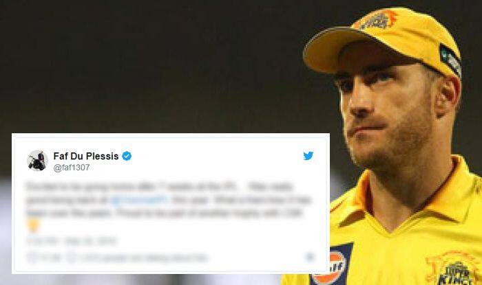 After spending a good 7 weeks, it is time for most foreign cricketers to return home. It seems Faf got a touch too emotional as his latest tweet reflected just that. His tweet read,”Excited to be going home after 7 weeks at the IPL… Was really good being back at @ChennaiIPL this year. What a franchise it has been over the years. Proud to be part of another trophy with CSK”.