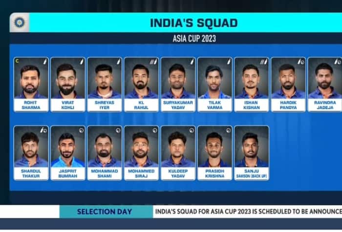 Here is India’s squad for the Asia Cup 2023: Rohit Sharma (Captain), Shubman Gill, Virat Kohli, Shreyas Iyer, Suryakumar Yadav, Tilak Varma, KL Rahul, Ishan Kishan, Hardik Pandya (VC), Ravindra Jadeja, Shardul Thakur, Axar Patel, Kuldeep Yadav, Jasprit Bumrah, Mohd. Shami, Mohd. Siraj, Prasidh Krishna