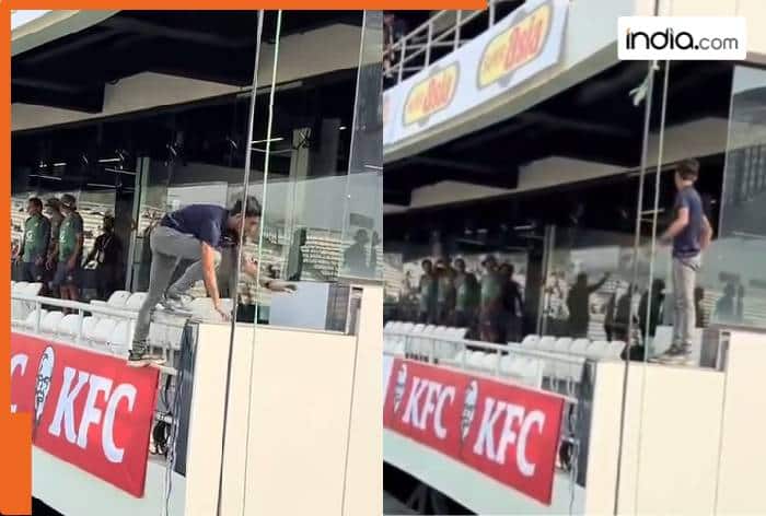 A viral video shows a fan climbing the enclosure at Gaddafi Stadium and entering Pakistan’s dressing room. Pakistan’s Test team and support staff were shocked to see the fan’s entry into the dressing room, they were seen asking him to leave.