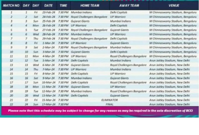 New Delhi: The schedule for Women’s Premier League 2024 is out and the tournament will be played in New Delhi and Bengaluru. The marquee event will start from February 23 where defending Champions Mumbai Indians will lock horns against finalist Delhi Capitals at M. Chinnaswamy Stadium in Bengaluru.