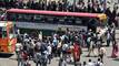 Men and women carrying luggage were spotted near Noida’s Sector 62 roundabout adjoining Ghaziabad and leading to interiors of Uttar Pradesh as they tried to cross over to the other side to catch privately-operated buses that were plying in full capacity.