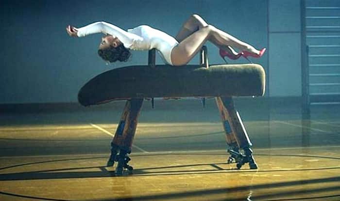 Kylie slips into a rather skimpy leotard, which shows off her immaculate figure. She then proceeds to dance all over the gymnastics equipment while still wearing really high red heels. She also poses in a rather seductive manner at times, and even performs a sexy routine with just a gym ball – bouncing on it suggestively.