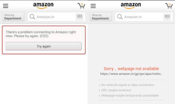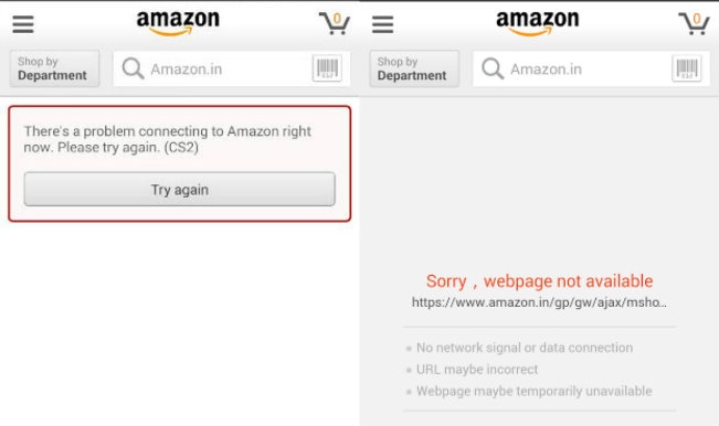 The app says, “There’s a problem connecting to Amazon right now. Please try again. (CS2)” . Whereas the website seems to be also facing some technical problem and shows the message, “Sorry, web page not available” . It cites down probable reasons such as no network signal or data connection, URL may be incorrect and web page may be temporarily unavailable.