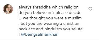 Some of the social media users asked him if he was really a Muslim as now they are confused. One user wrote, “Which religion do you believe in? please decide we thought you were a muslim, but you are wearing a christian necklace and hinduism you salute ! @beingsalmankhan.” While the other commented, “U Muslim or not?”
