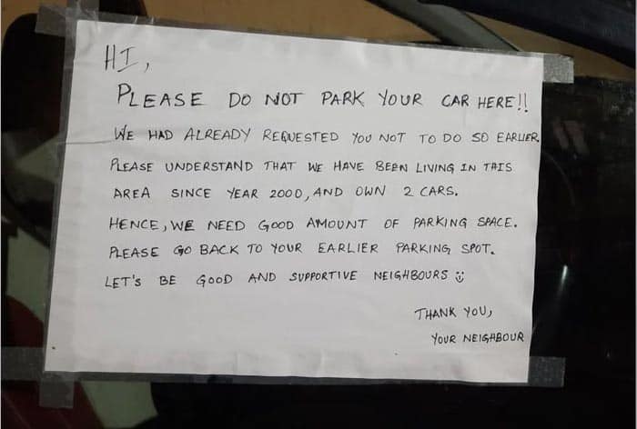 The note emphasised “Hi, please don’t park your car here!! We had already requested you not to do so earlier. Please understand that we have been living in this area since the year 2000, and own 2 cars. Hence, we need a good amount of parking space. Please go back to your earlier parking spot. Let’s be good and supportive neighbours.” He had signed it off with “your neighbour”.