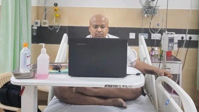 An image has gone viral showing a man on a hospital bed sitting before a laptop and appearing for his interview, while going through a session of chemotherapy.