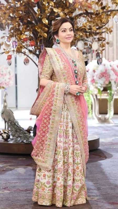 Nita Ambani's contemporary pink hued lehenga choli with jewels and sequins is the bling you need.
