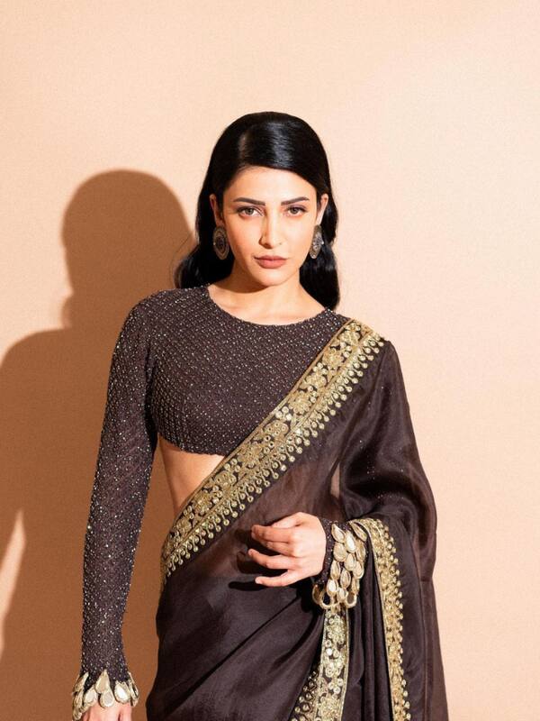 The diva styled the black saree with a modern twist of cutout blouse. Shruti Haasan gives ultimate fashion goals.