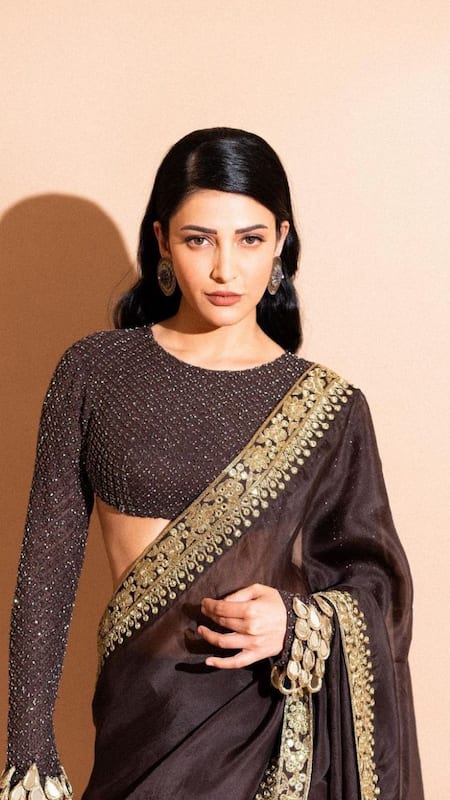 Shruti Haasan dazzles in a full-sleeved blouse adorned with intricate beadwork and a rich, dark hue, perfect for a grand and elegant look.
